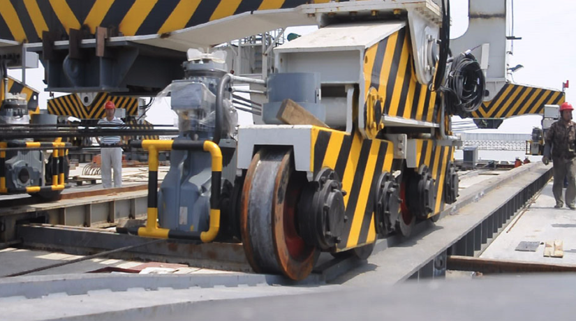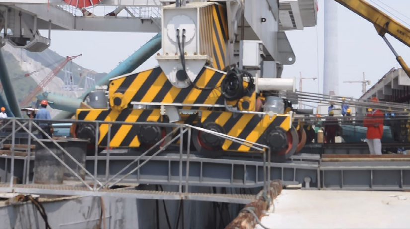 該兩臺卸船機于2013年6月底在張家港制造基地整機安裝結束后,于7月11日開始滾裝,分別于7月11日,7月13日滾裝上船,7月17日出港,經(jīng)7天海上航行后,卸船機抵達電廠碼頭,7月26日和28日,卸船機正式滾裝上岸并順利頂升入軌。